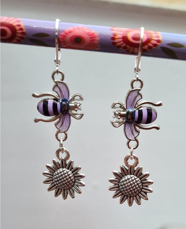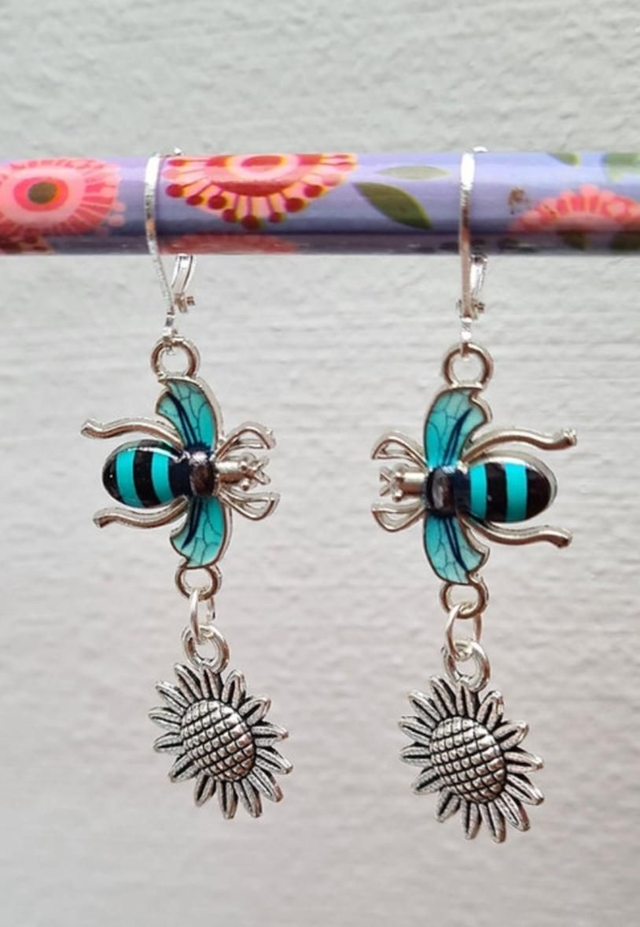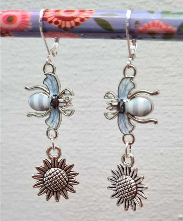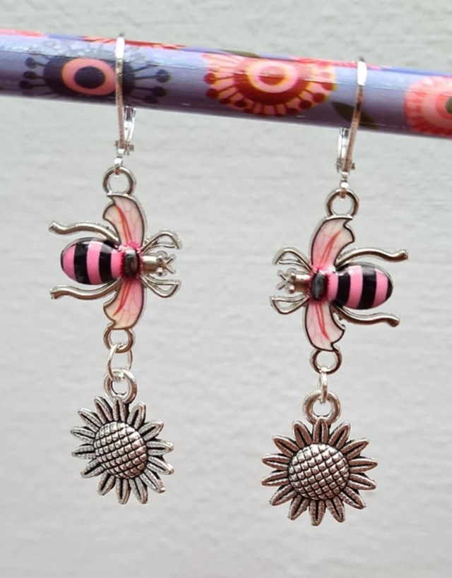 Bee Striped Enamel Sunflower Earrings Silver