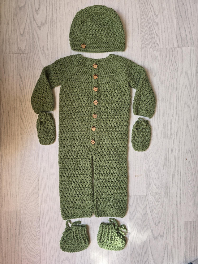 Unique handmade sage green crochet baby all-in-one romper hat mittens boots set