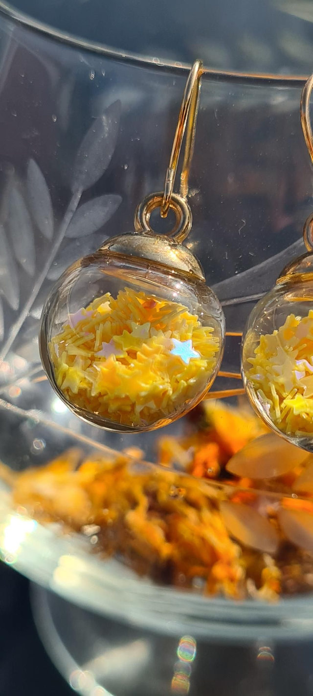 Earrings glass ball bauble glitter confetti yellow stars