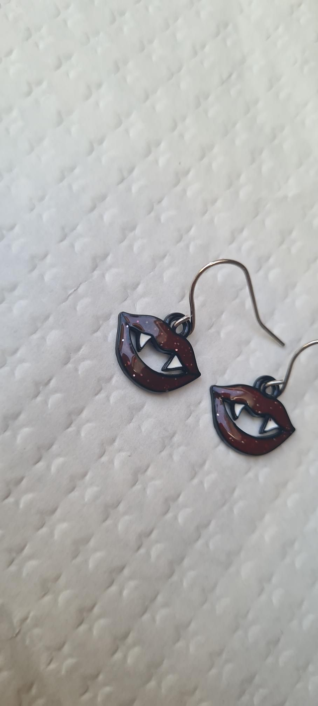 Earrings red enamelled glitter lips white fangs