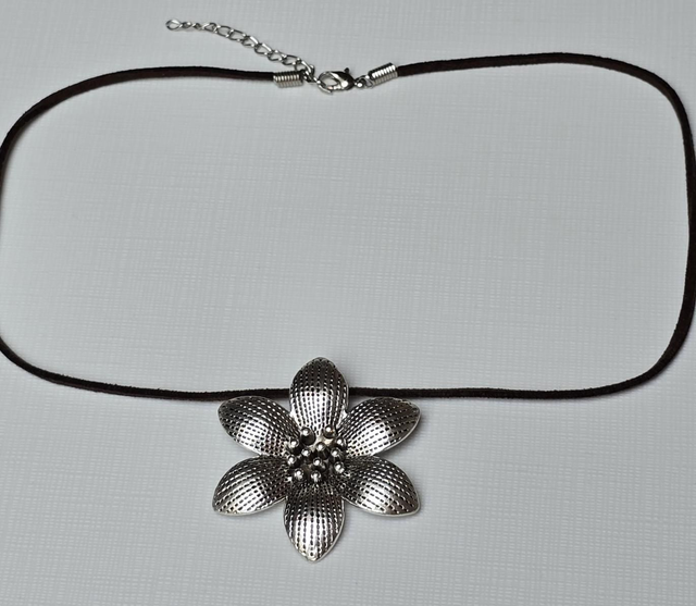 Necklace brown faux leather thong with a large silver flower pendant